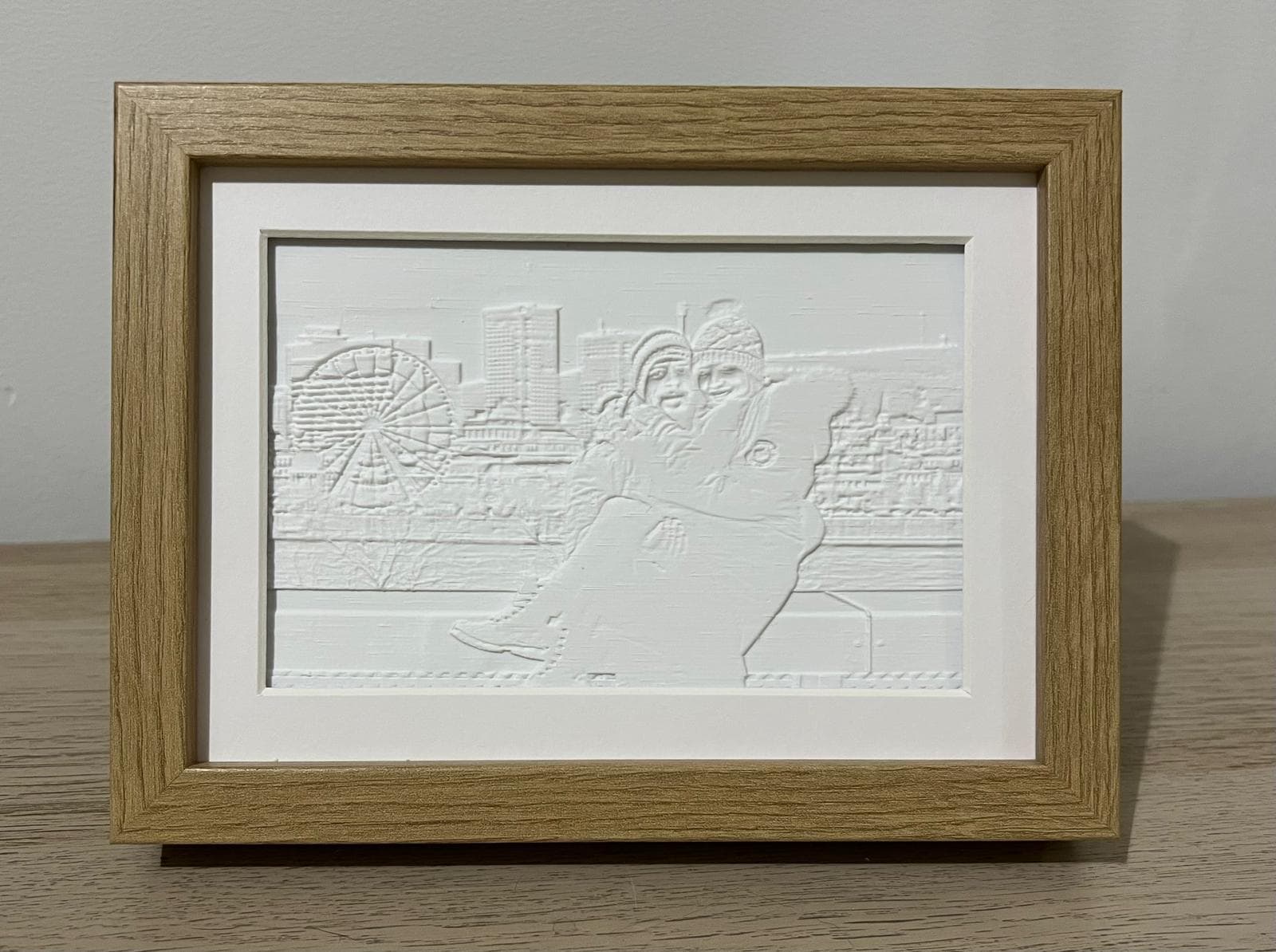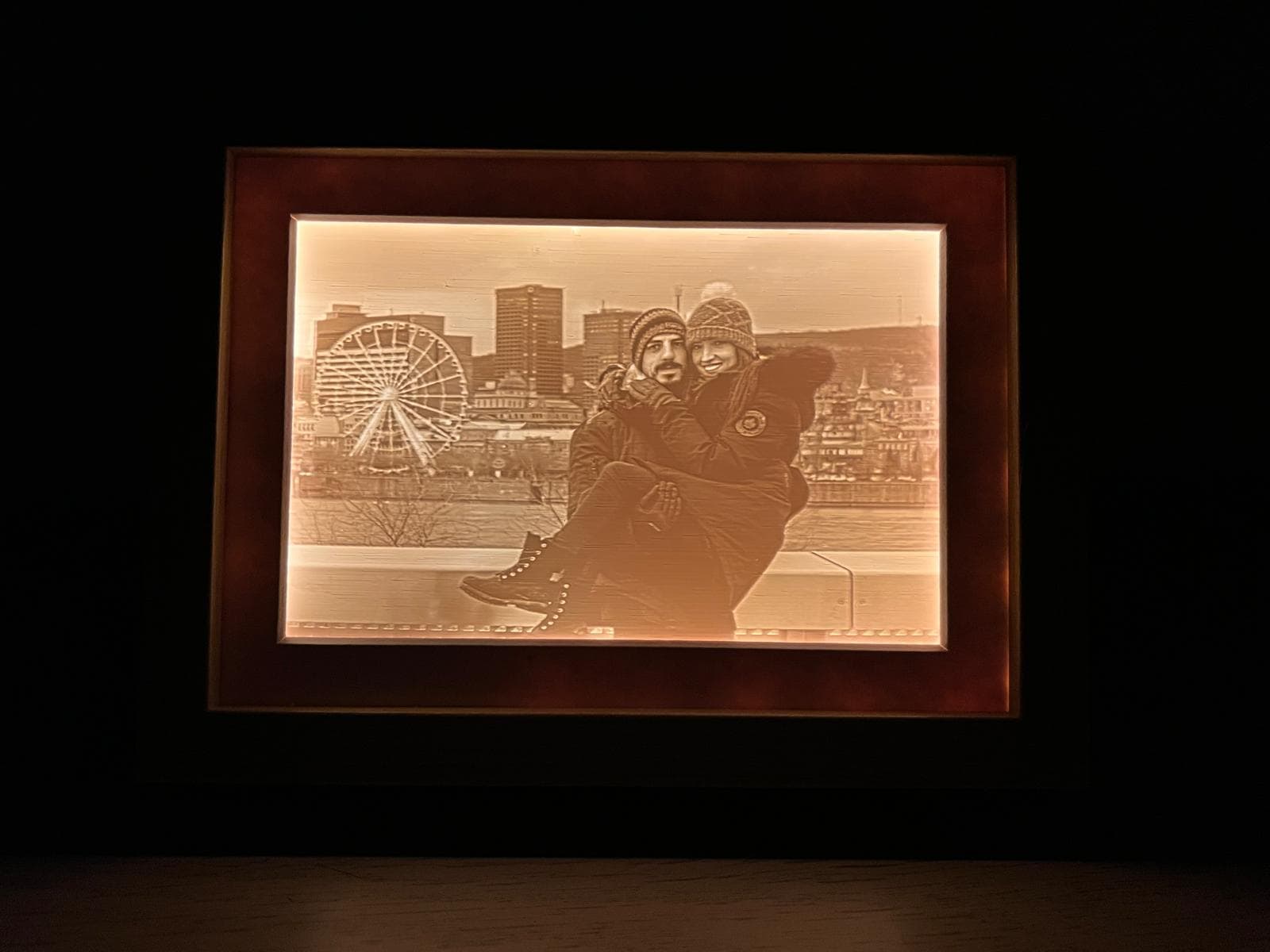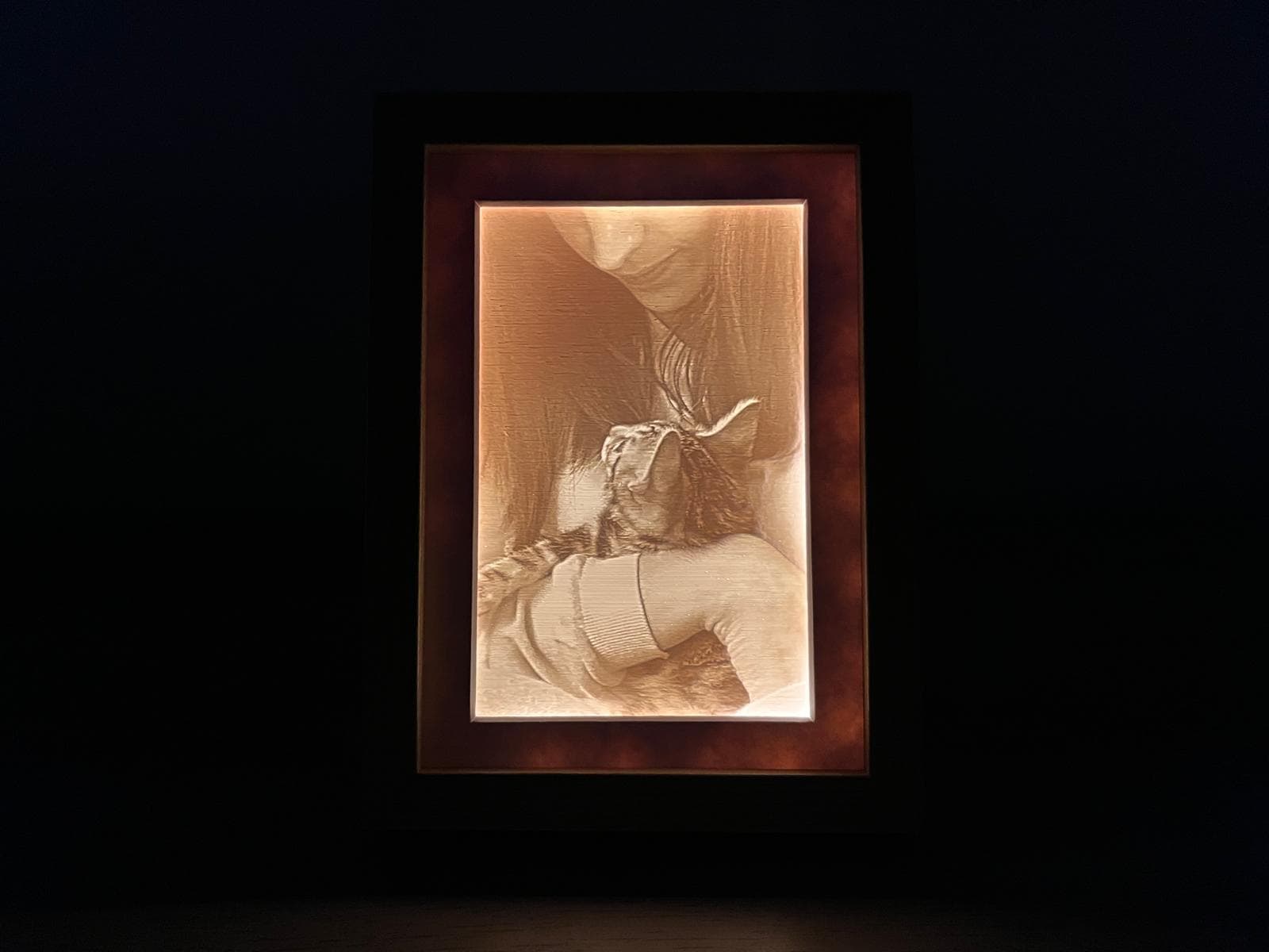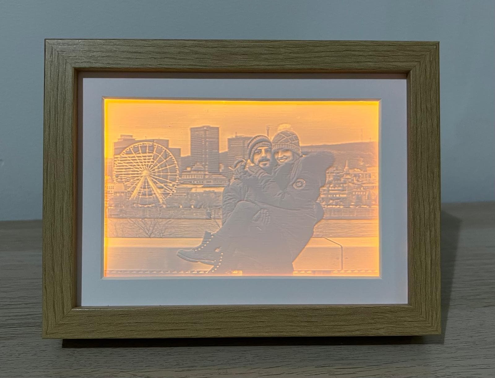 Una litofanía es una imagen grabada en una fina capa de material translúcido que solo se ve al trasluz. Imprimimos tu foto en 3D y la montamos en un marco de madera con tira LED incluida. El resultado es una pieza cálida, única, imposible de encontrar en ninguna tienda. Perfecta como regalo para cualquier ocasión.